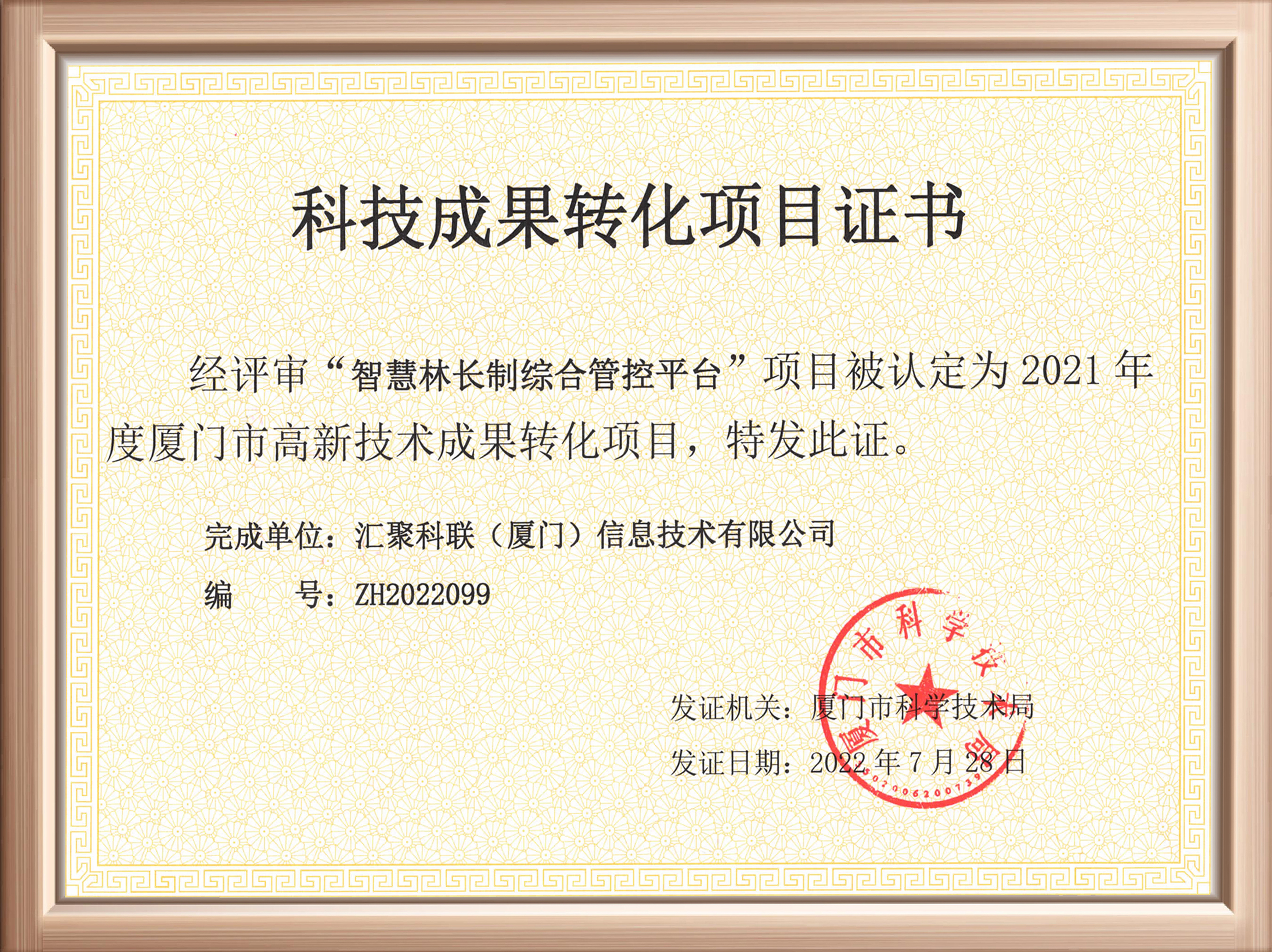 近日,匯聚科聯收到廈門市科技局頒發(fā)的“科技成果轉化項目證書”,公司“智慧林長制綜合管控平臺”經過評選,成功被認定為2021年度廈門市高新技術成果轉化項目。